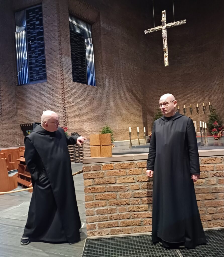Aus dem anfangs kühnen Gedanken reifte die Idee, tatsächlich ins Sauerland zu reisen und mit unseren ökumenischen Religionskursen einen Tag lang in der Abtei zu verbringen. Sozusagen in Form einer gemeinsamen Wallfahrt. Gesagt, geplant, gerechnet, verworfen, neu gerechnet … Endlich konnten wir dank großzügiger Unterstützung einen Reisebus chartern und tatsächlich mit all unseren Schützlingen einen anregenden Tag (kulinarisch wie geistig/geistlich) in der Abtei Königsmünster genießen. Der Höhepunkt war dann die Segnung unseres Kreuzes durch die Mönche nach einer Andacht in der Klosterkirche.