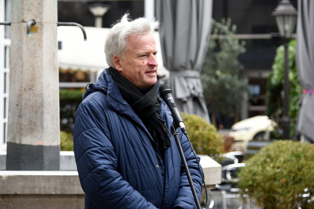 Beim Gedenken an die Opfer des Holocaust gehe es auch um „unsere Glaubwürdigkeit als Christinnen und Christen“, eröffnete der stellvertretende Stadtsuperintendent Markus Zimmermann. „Denn wir berufen uns auf Jesus von Nazareth, der Jude war.“ Es gehe für uns immer darum, uns klar zu machen, dass die Wurzel unseres Glaubens das Judentum sei, verwies er auf Paulus (Röm 11,18). Natürlich sei unseren Kirchen das Gedenken auch deswegen ein wichtiges Anliegen, „weil es ein unerträglicher Gedanke bleibt, dass unsere jüdischen Geschwister damals verfolgt und ermordet worden sind. Unerträglich ist es auch heute wahrzunehmen, dass Antisemitismus und Judenfeindlichkeit wieder zunehmen“. Dagegen einzutreten und Zeichen zu setzen, gehöre zu den Kernaufgaben unserer Kirchen. Er bat die jungen Menschen, ebenfalls aufzustehen „gegen jede noch so heiter gemeinte verletzende Bemerkung“.